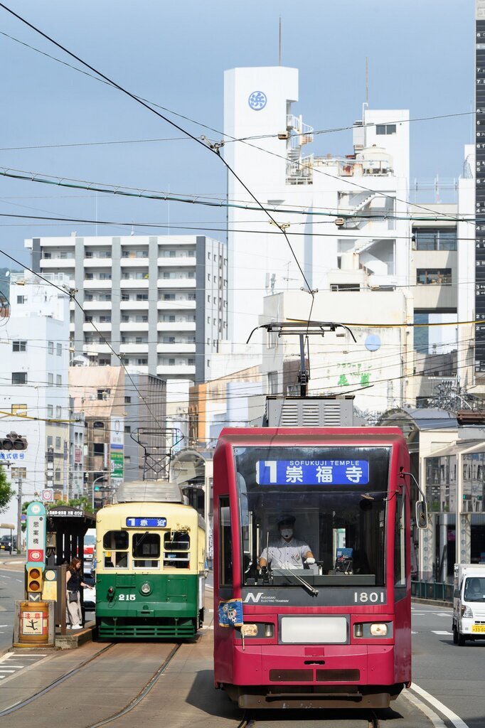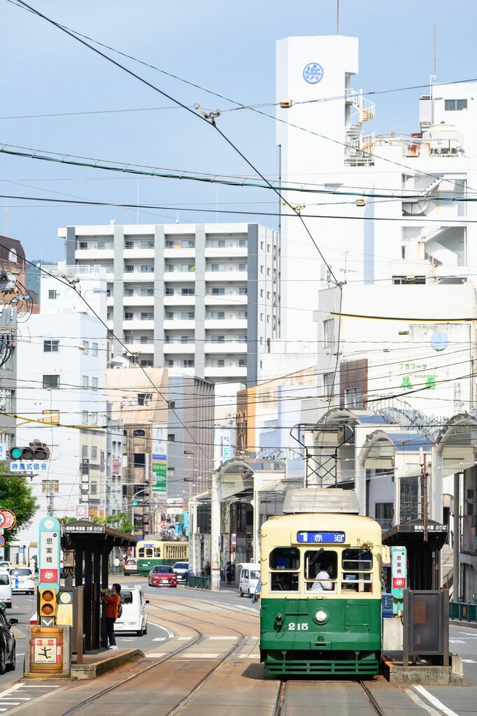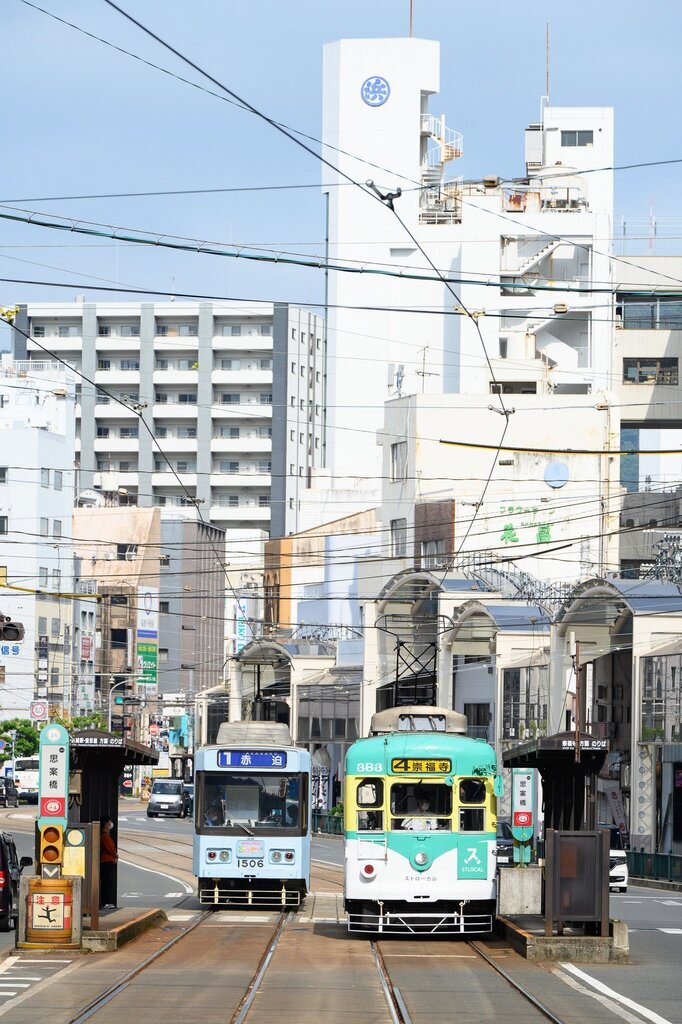 長崎電軌の路面電車、今回は観光客が来ることも多い思案橋電停界隈の写真です。