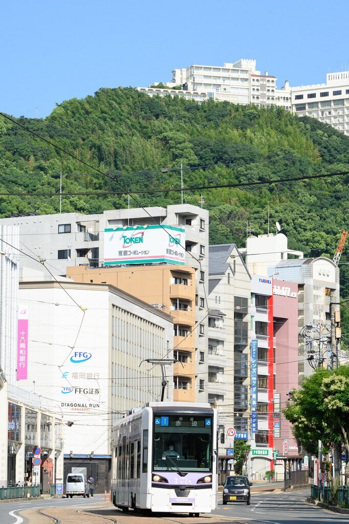背景の山の上に見える建物は、市街と港を一望できるというのが売りのホテル「矢太樓(やたろう)」です。もしかするとホテルから路面電車も撮れるのかもしれません。気になりますね。