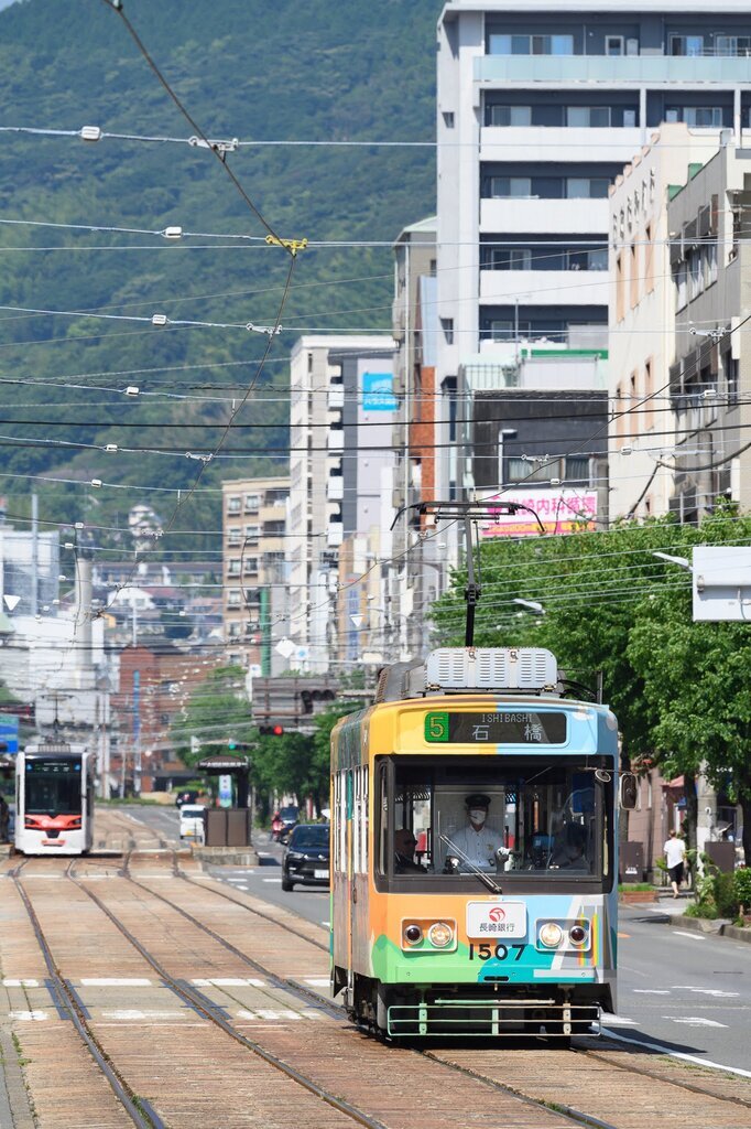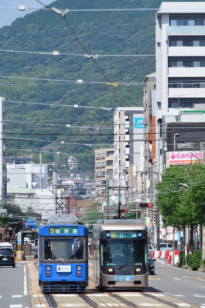 2023-10-01 めがね橋電停から 長崎電気軌道 路面電車 今回も長崎電気軌道の路面電車です。 めがね橋電停から市役所方面にカメラを向けるとこちらも背景は山になります。これが長崎らしさというところでしょうか。 本数が多いのでタイミングによってはすれ違いも撮れます。 先の2枚は300mmでの撮影でしたが、こちらは180mmになります。雲の様子も写ってこの方が夏らしいかもしれません。